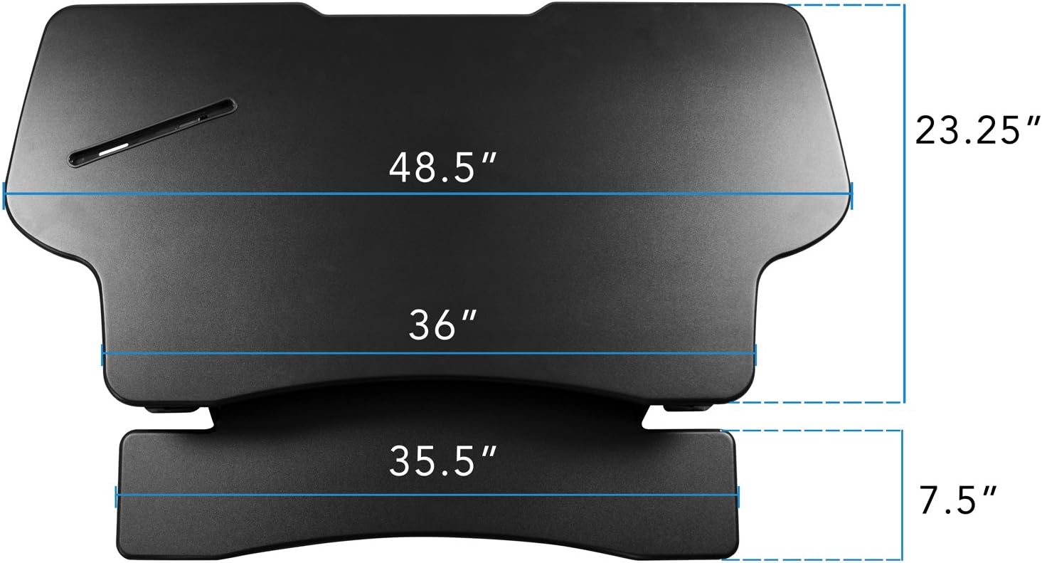 - Expansive Extra Large Workspace: The 48-inch surface provides ample space for dual monitors or a monitor and laptop setup, enhancing your ability to multitask effectively. This spacious desk riser is designed to accommodate all your essential work tools, from documents to tech gadgets, ensuring everything you need is within easy reach. It has a 35.5" wide keyboard tray.
