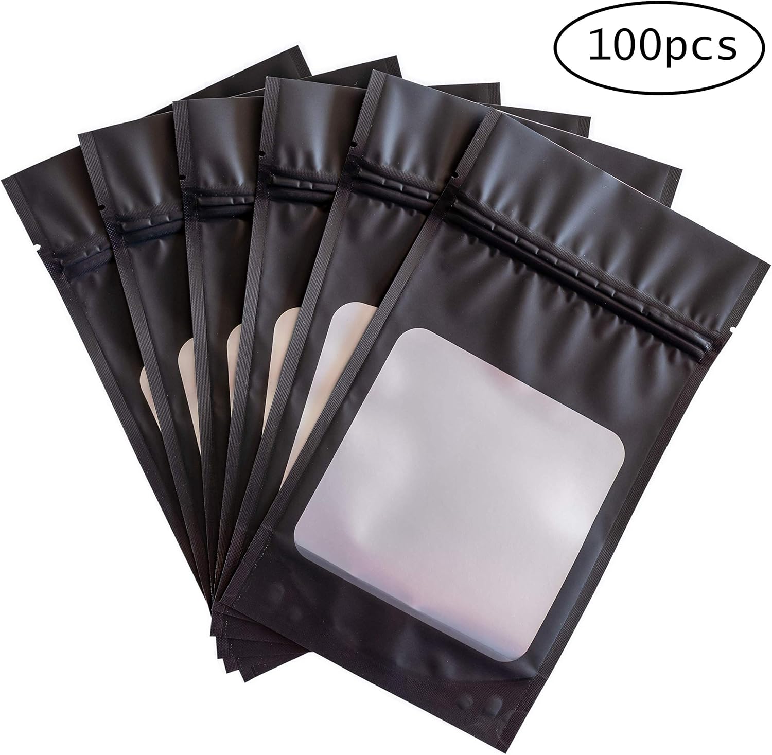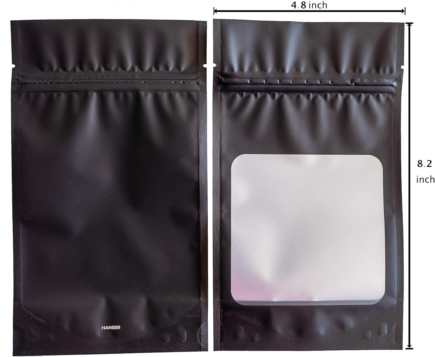 HANSER | Smell Proof Odorless Mylar Resealable Foil Pouch Bags with clear Window | Stand up bottom | Airtight | matte black | 100 Pieces | 4.8x8.2 Inches