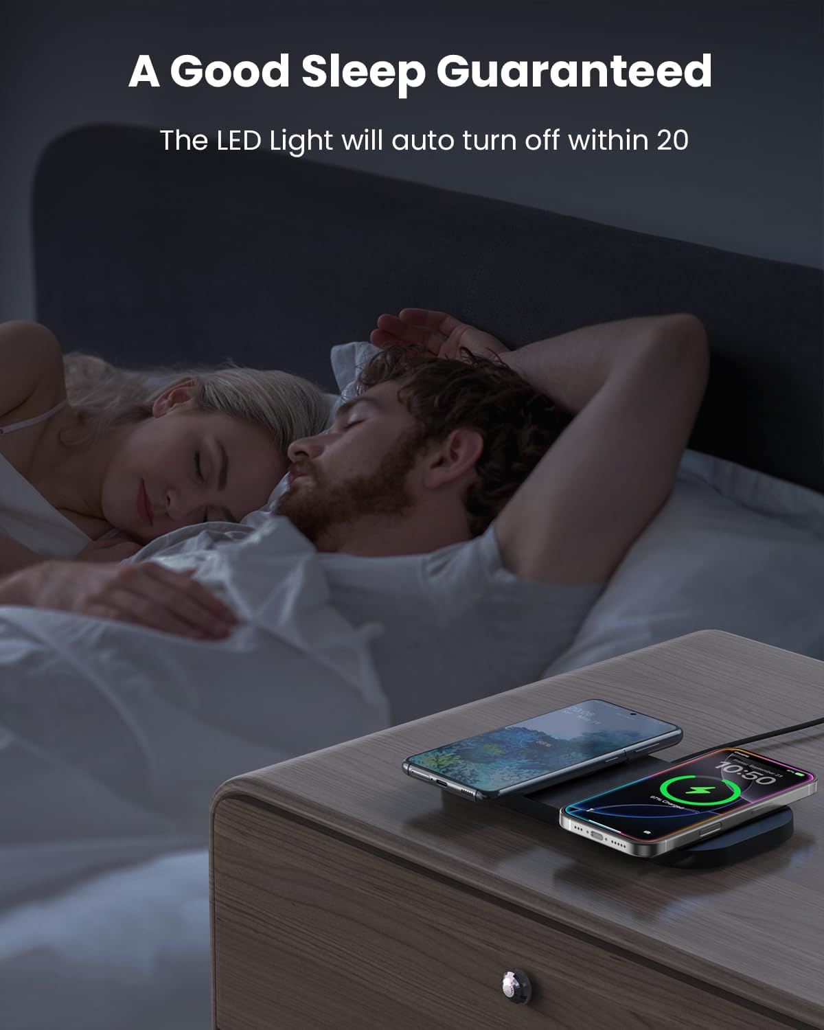 - 【Sleep Friendly & Case Friendly】Find your ideal bedside charger here! When the dual wireless charger is connected to power, the indicator light will be on for 20s and then auto turn dark so as not to disturb your sleep. Better still, this wireless charger pad supports charging with most phone cases up to 5mm/0.2in thick (Note: Magnetic, metal attachments and other foreign objects will interfere with charging).
