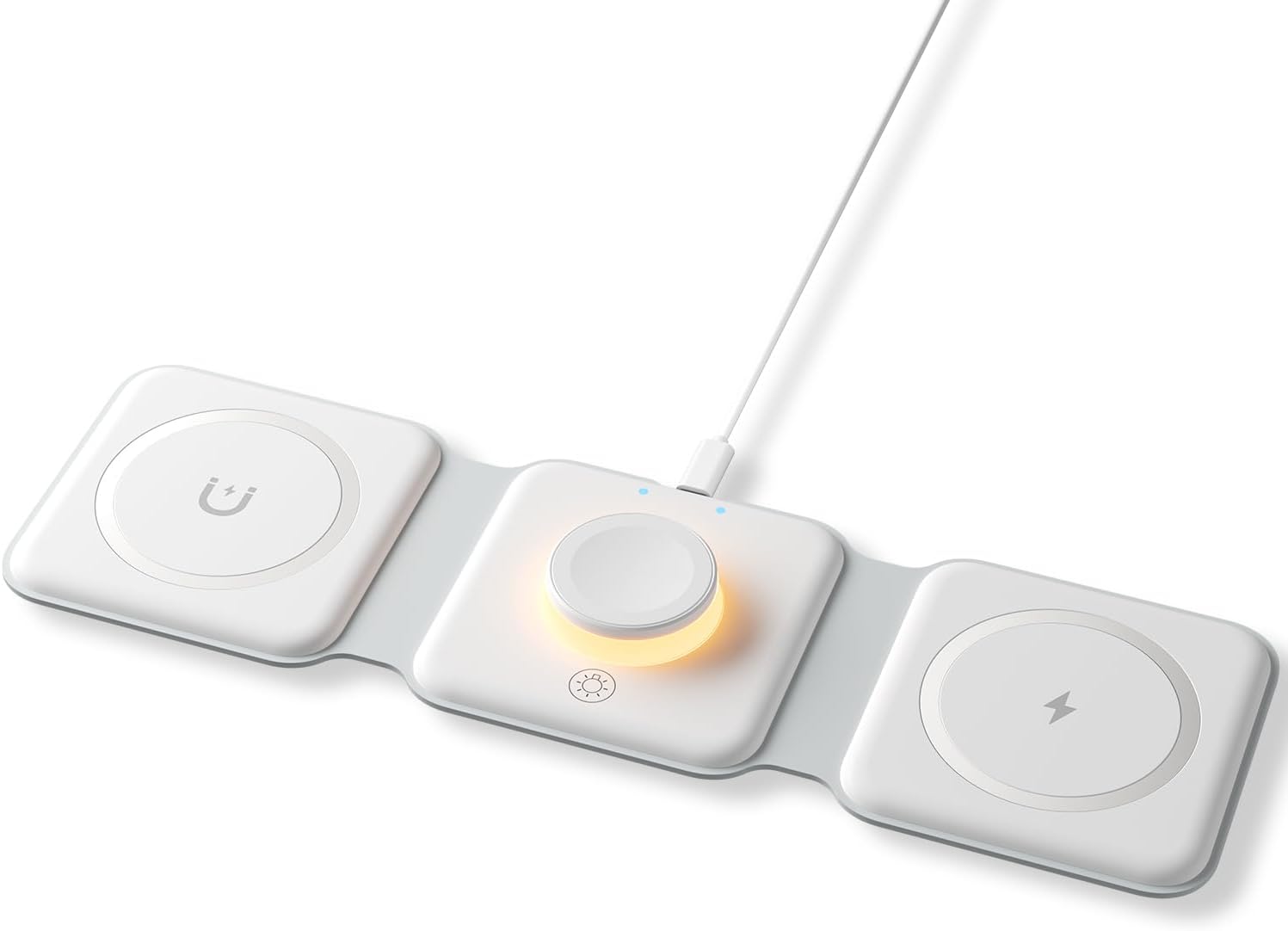 ESSAGER 3 in 1 Foldable Wireless Charger for iPhone 16/15/14/13/12/11 Series, Magnetic Wireless Charging Station, Travel Wireless Fast Charging Pad for Airpods 4/3/2/Pro, iWatch (3 in 1, White)