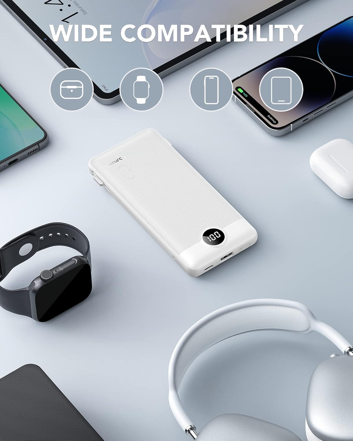 VRURC Portable Charger,Power Bank Built-in Cables and AC Wall Plug, USB C Portable Bank 10000mAh, Travel Essentials Phone Charger Compact External Battery Pack for Smart Phones, Tablets etc-White