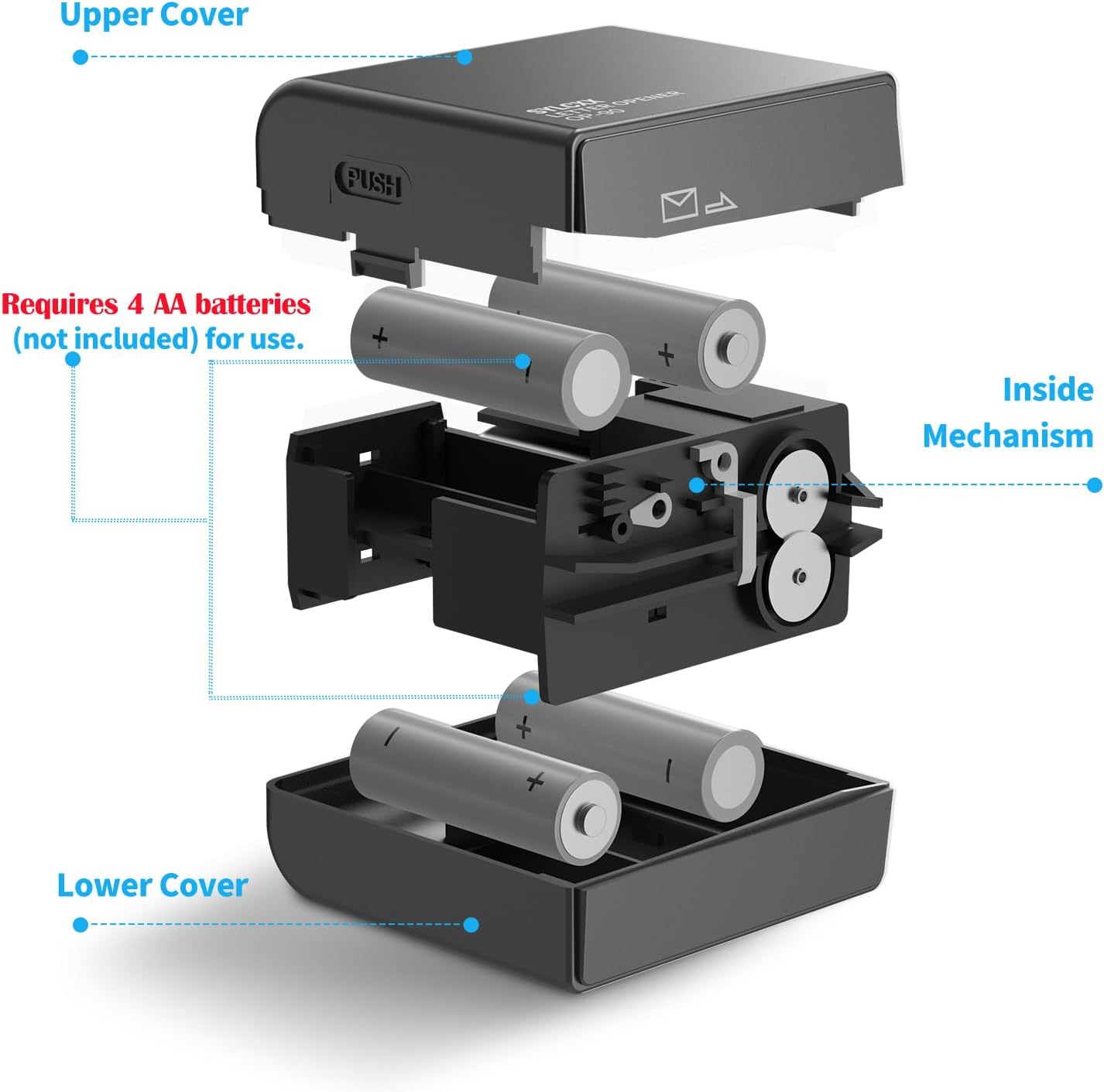 - Letter opener requires 4 AA batteries (not included). Install the 4 AA batteries in the correct way: 1,Place the letter opener upside down. Press the "PUSH" position on both sides of the top cover firmly.2, Take out the internal structure, put 2 AA batteries on the front side of the internal structure (make sure of the +/- direction), and put 2 AA batteries on the reverse side of the internal structure. 3, Put on the upper and lower covers and start working