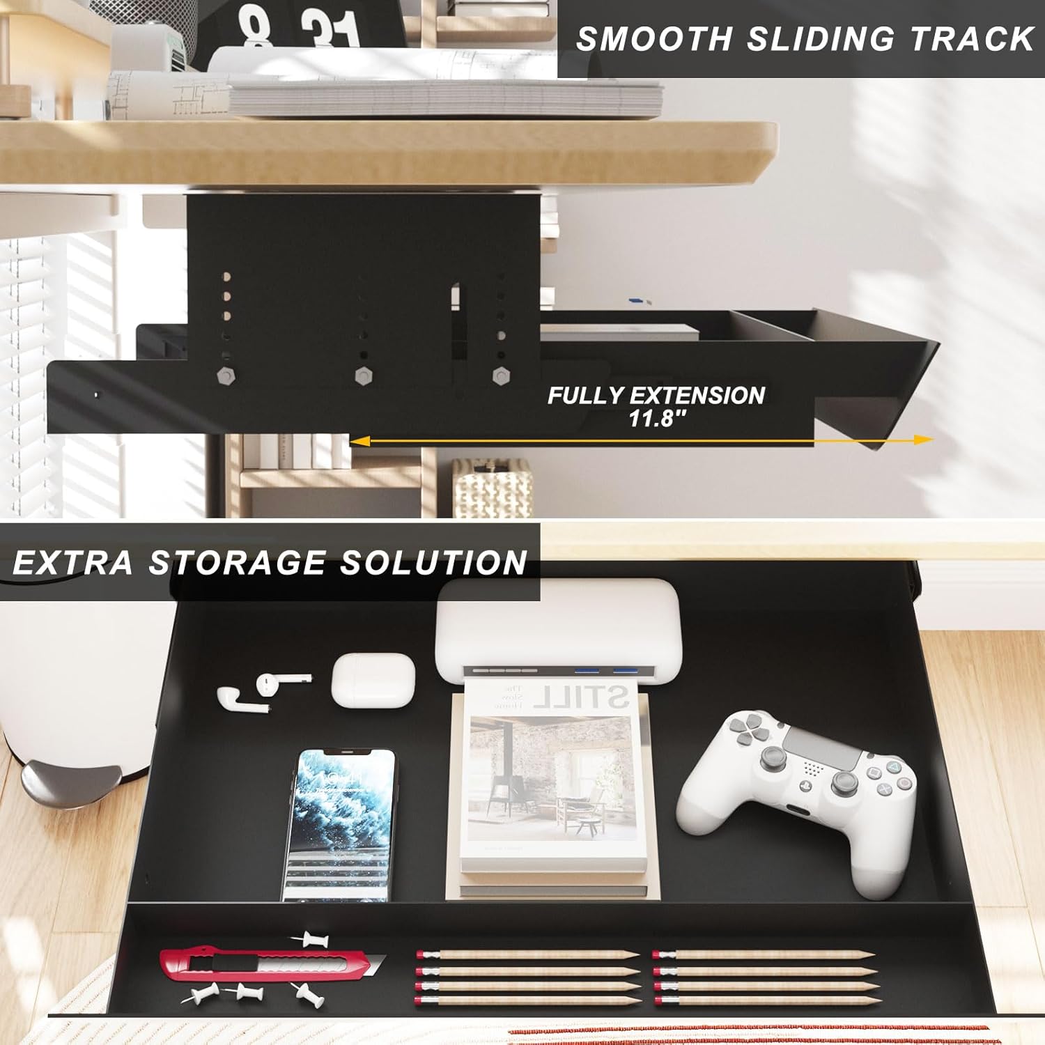 - Humanized Detail Design:This drawer is designed with a pencil tray for storing pencils.A 60° tilted panel, doesn't interfere with leg room.Three-section rails, and can be fully pulled out.