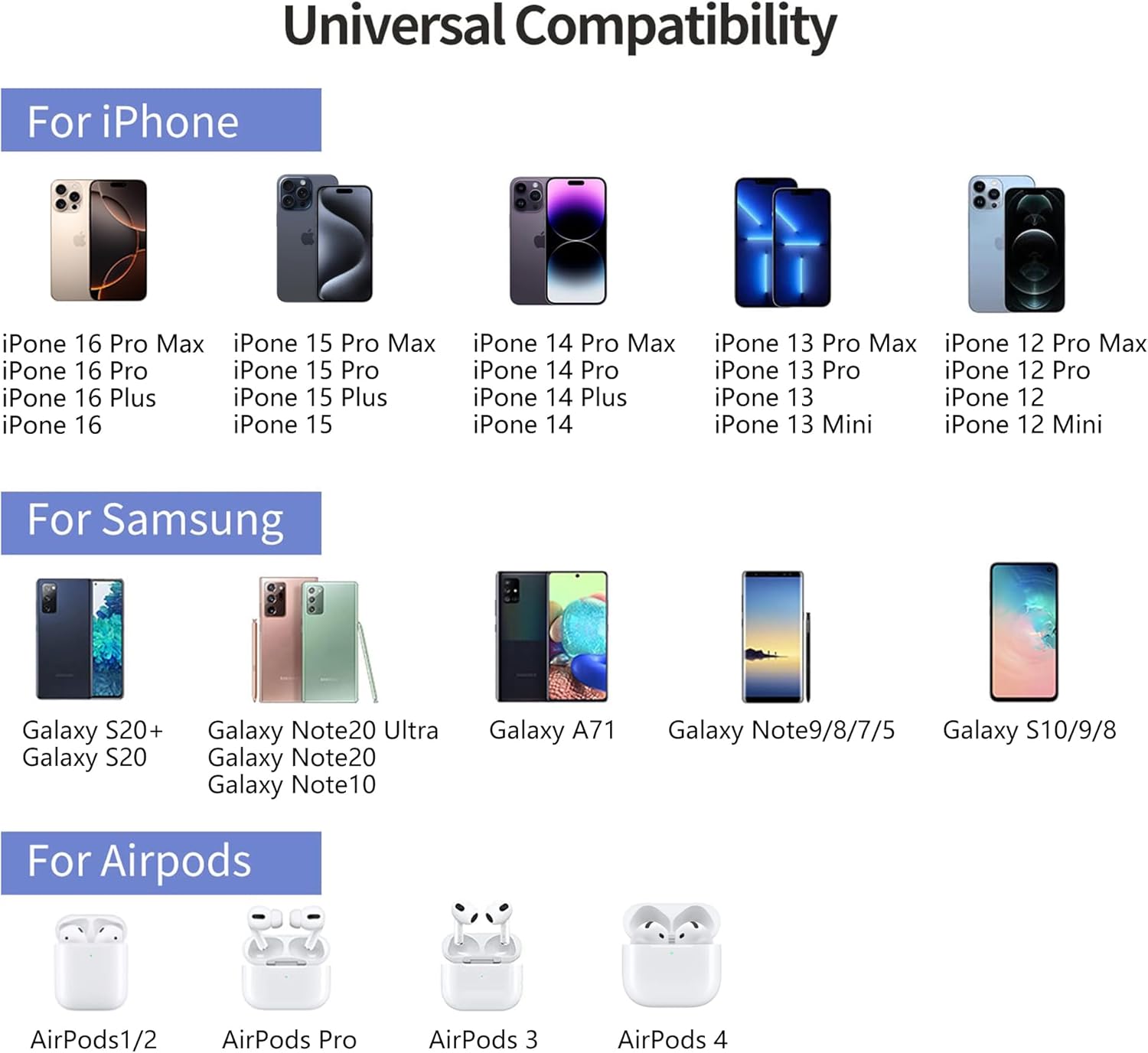 - 【Universal Compatibility】- Our Wireless charger is universally compatible with all wireless phones. For iphone series such as iphone 16/16 Plus/16 Pro/16 Pro Max/15/15 Plus/15 Pro/15 Pro Max/14/14 Plus/14 Pro/14 Pro Max/13/13 Pro/13 Pro max/12/12 Pro/12 Pro max/12 mini/SE/11/11 pro/11 Pro max/X/Xs/Xs Max/8/8 Plus. For Samsung phones such as Galaxy S22/S21/S20/S10/9/8/7 seris, Note20 Ultra/Note20/Note10/9/8/7/5. And other wireless phones and headphones (Can not charge watch)