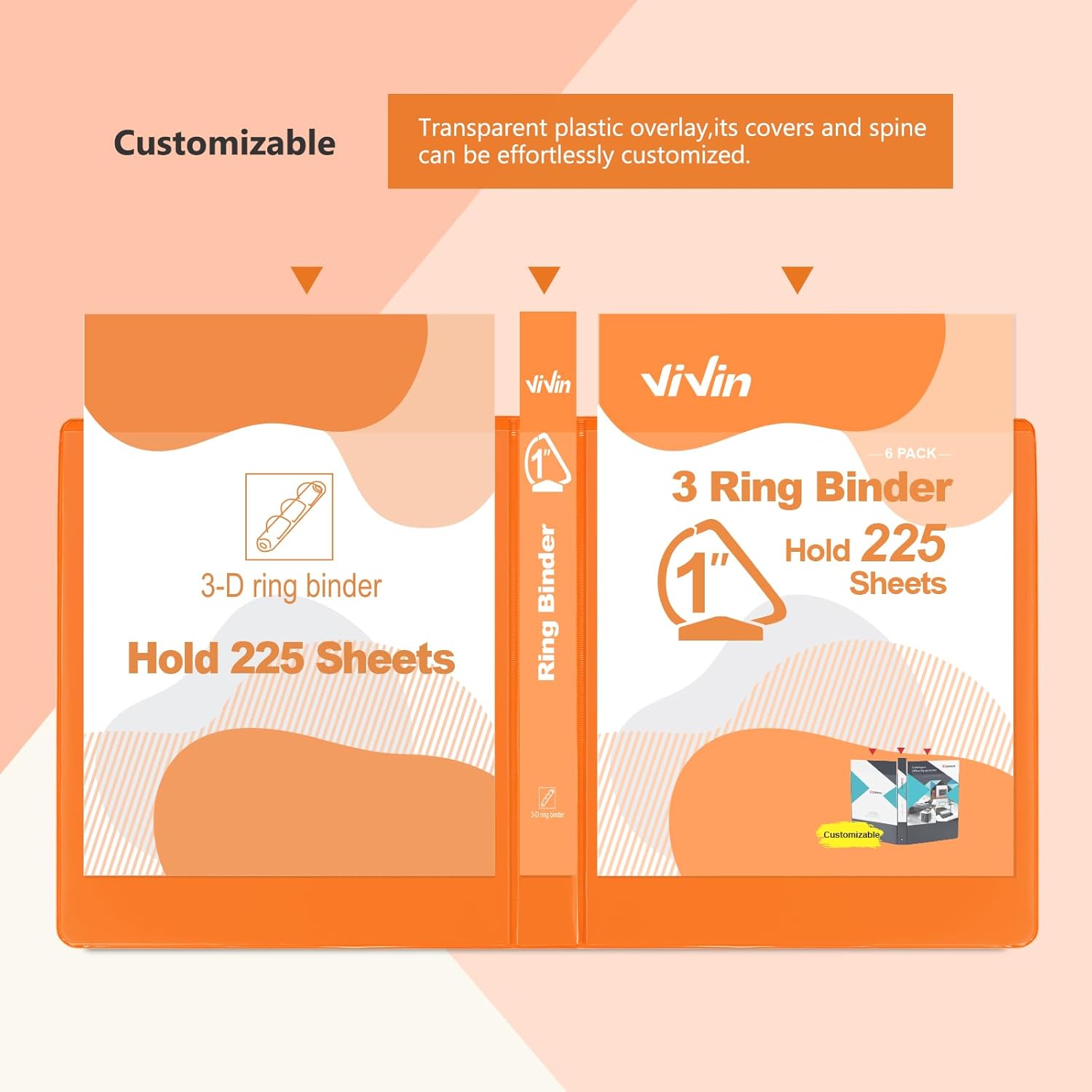 ViVin Sturdy 1 Inch D Ring Binders, 3 Ring Binders with 2 Pockets, Hold 225 Sheets of US Letter Size Paper for Office,Home,School, 6 Pack (Orange)
