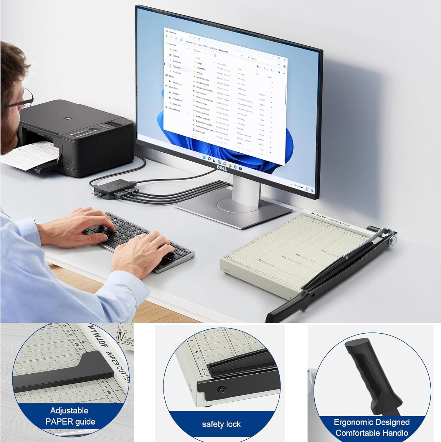 - 【HOW TO EASILY CUT PAPER WITH A PAPER CUTTER】Open the detachable blade on the right side and remove it from the safety lock. Lift the blade handle to facilitate placing the paper.