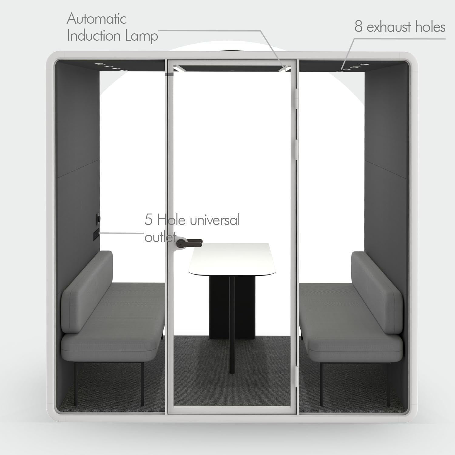 - [ Interior Features & Ventilation ] This booth features an efficient fresh air system with 8 exhaust vents (4 intake + 4 outtake) to enhance air circulation. It includes adjustable LED lighting with dimmable brightness and customizable color temperature, a durable carpet, a sturdy desk, and multiple power outlets (2 universal AC outlets, 1 USB Type-A port, and 1 USB Type-C port) to meet your workspace needs. Sofa not included.