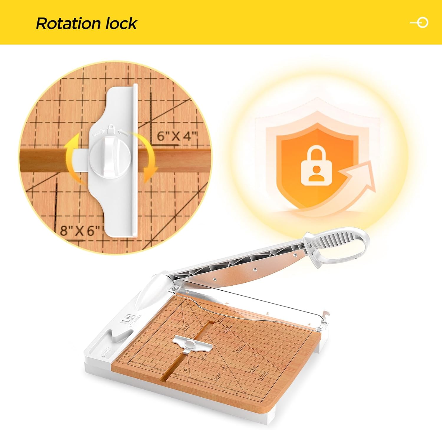 - Secure Clamping and Safety Features: Designed with a safety protect board,ergonomic handle, safety latch, and automatic lift, this guillotine prioritizes your safetyand comfort during use.