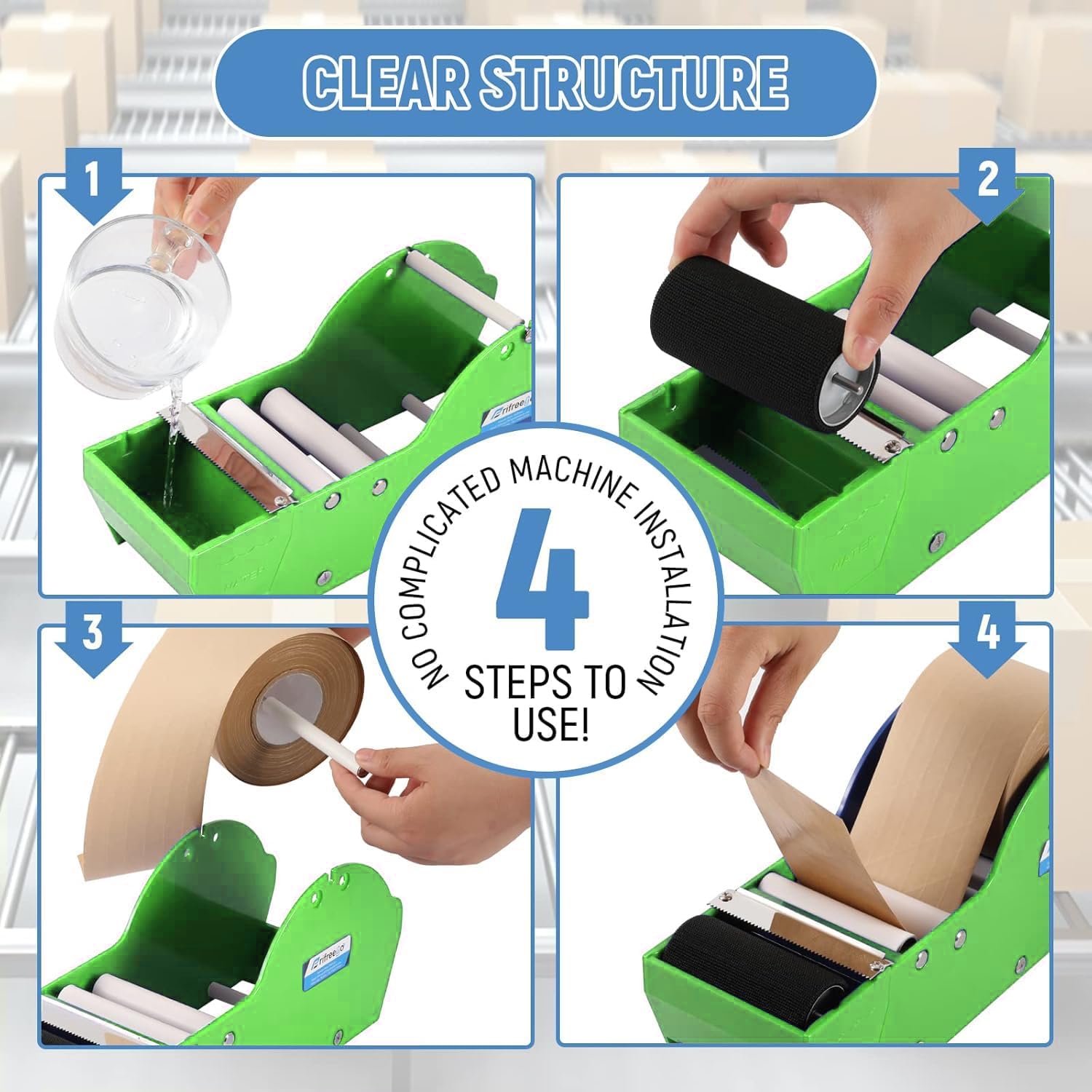 - Easy To Use: 4-Steps to install, simple and convenient, you could quickly use this water activated tape dispenser to pack your case. Please note: the tape on the picture is NOT included